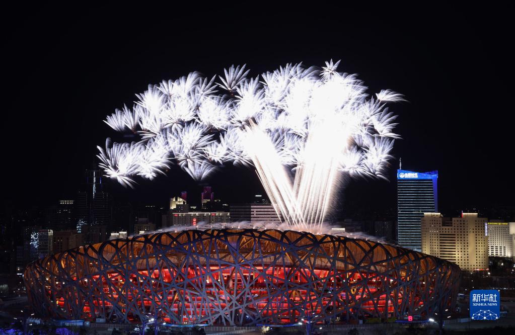 在第二十四屆冬季奧林匹克運動(dòng)會(huì )開(kāi)幕式上,焰火綻放在北京國家體育場(chǎng)上空(2022年2月4日攝)。