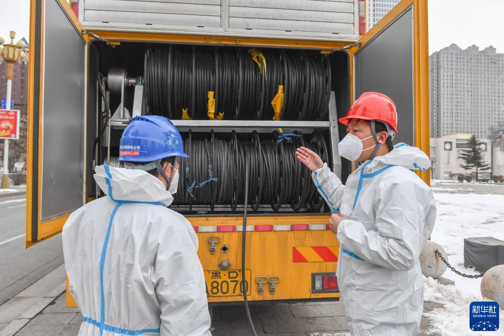 3月18日,國網(wǎng)吉林供電公司的黨員林穆(右)與前來(lái)支援的國網(wǎng)佳木斯供電公司的黨員關(guān)力一起為醫療單位設計保電方案。