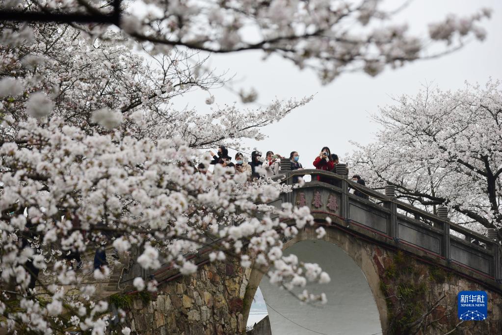 3月19日,游客在江蘇省無(wú)錫市太湖黿頭渚景區欣賞盛開(kāi)的櫻花。