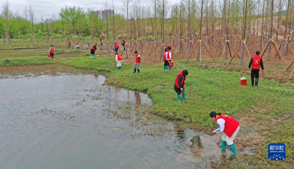 3月21日,浙江省臺州市仙居縣中心幼兒園黨員志愿者在永安溪濕地公園拾撿雜物垃圾、打撈河面漂浮物(無(wú)人機照片)。