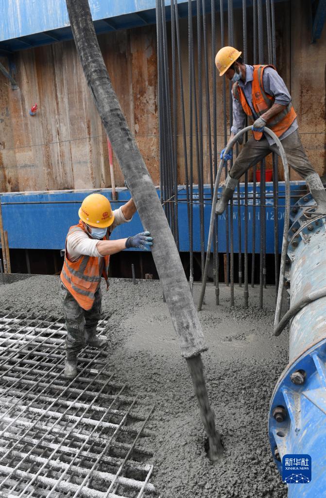當日,在廣西上林至橫州高速公路建設施工現場(chǎng),工人們加班加點(diǎn)完成控制性工程——西津郁江特大橋水中承臺的澆筑作業(yè)。