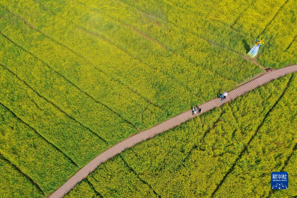 3月8日,游客在重慶市大足區中央城市花海公園的油菜花田游玩,該片油菜花田均為“慶油系列”油菜品種(無(wú)人機照片)。