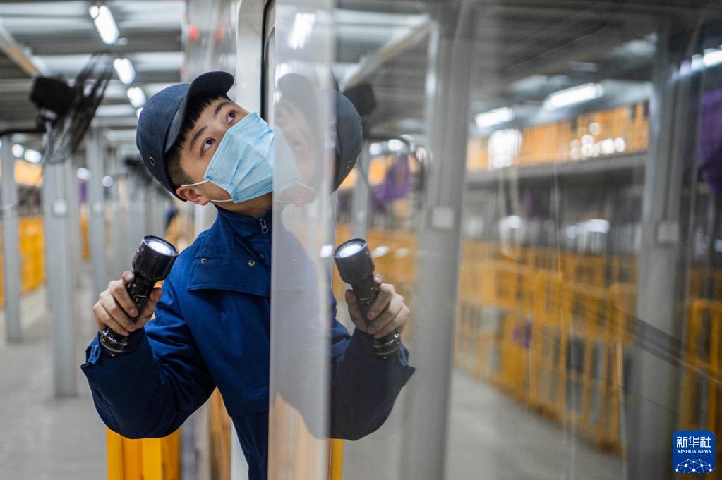 3月23日,武漢地鐵三金潭車(chē)輛段8號線(xiàn)月修庫員工在檢查地鐵車(chē)門(mén)。