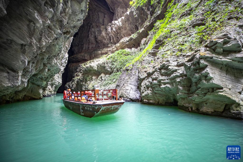 3月22日,在重慶市黔江區濯水鎮蒲花暗河景區,游客乘船參觀(guān)游玩。