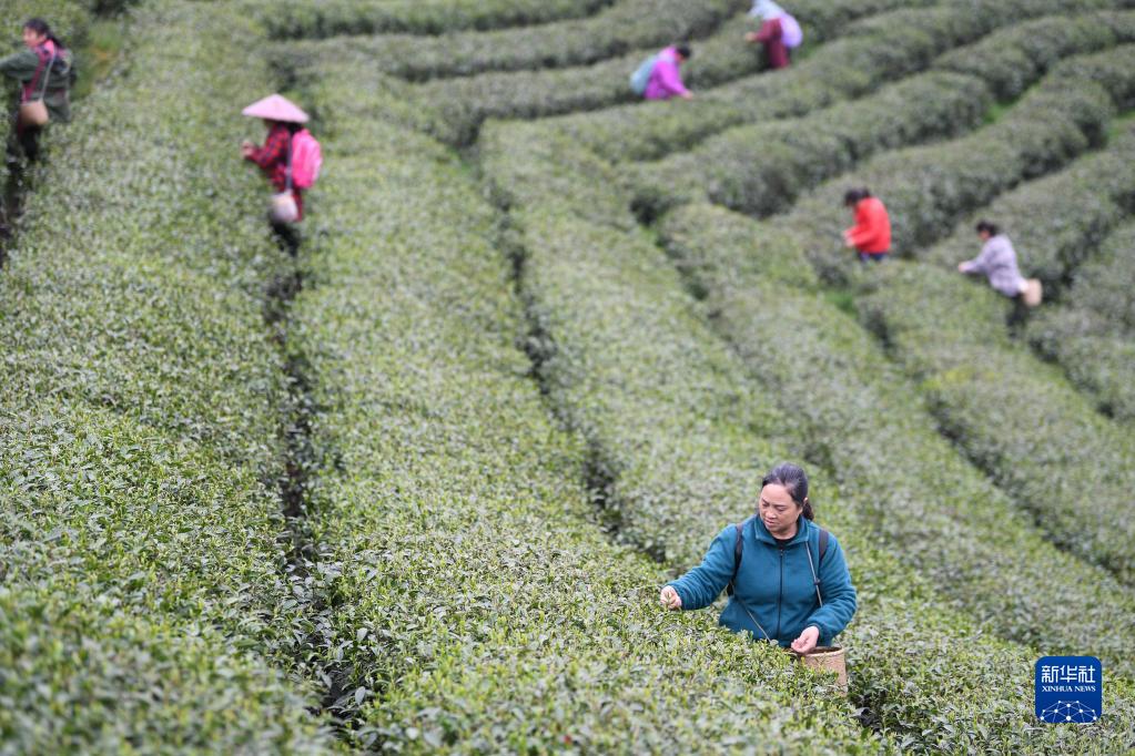 3月24日,茶農在貴州省遵義市余慶縣松煙鎮二龍茶山采摘明前茶。