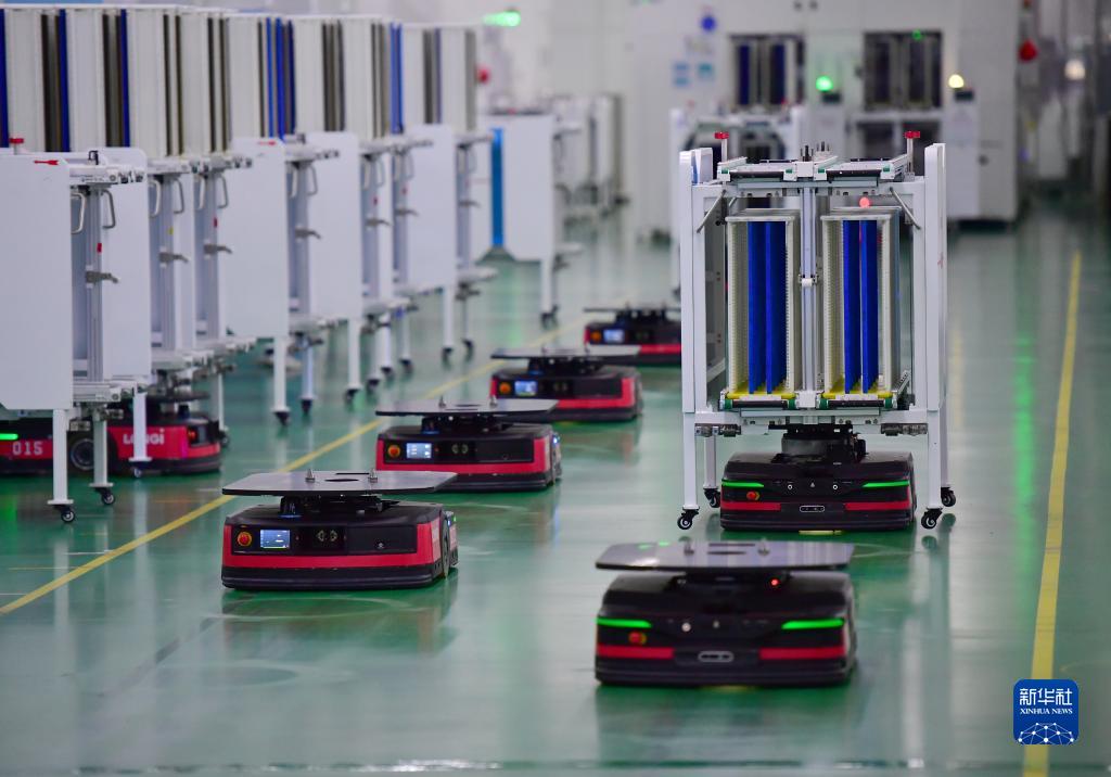 3月25日,智能搬運機器人在隆基單晶硅太陽(yáng)能電池工廠(chǎng)內工作。