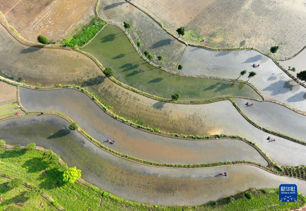 4月7日,四川省廣安市前鋒區代市鎮繭莊村的黨員服務(wù)隊在幫助村民耕田,準備栽插秧苗(無(wú)人機照片)。