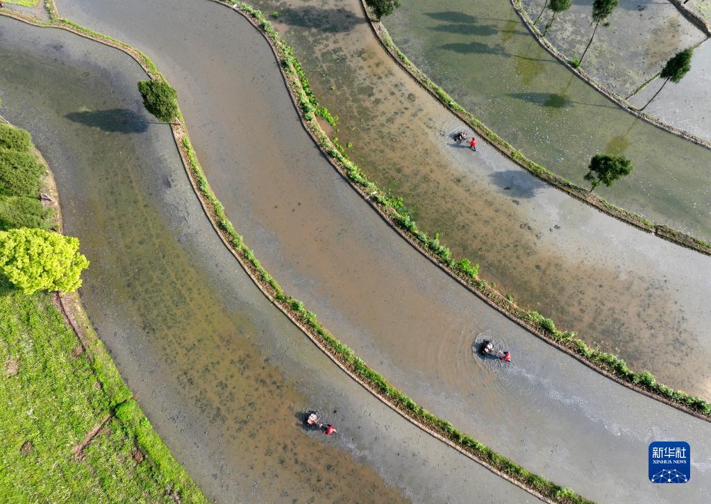 4月7日,四川省廣安市前鋒區代市鎮繭莊村的黨員服務(wù)隊在幫助村民耕田,準備栽插秧苗(無(wú)人機照片)。