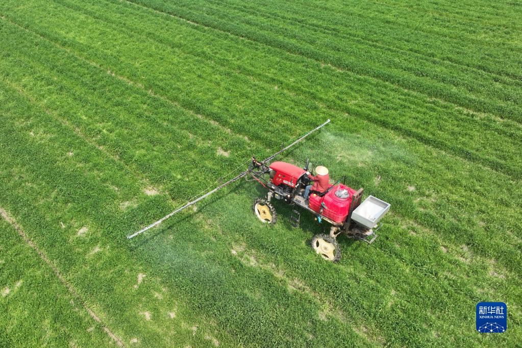 4月7日,在江蘇省淮安市洪澤區三河鎮,農民駕駛農機在麥田里作業(yè)(無(wú)人機照片)。