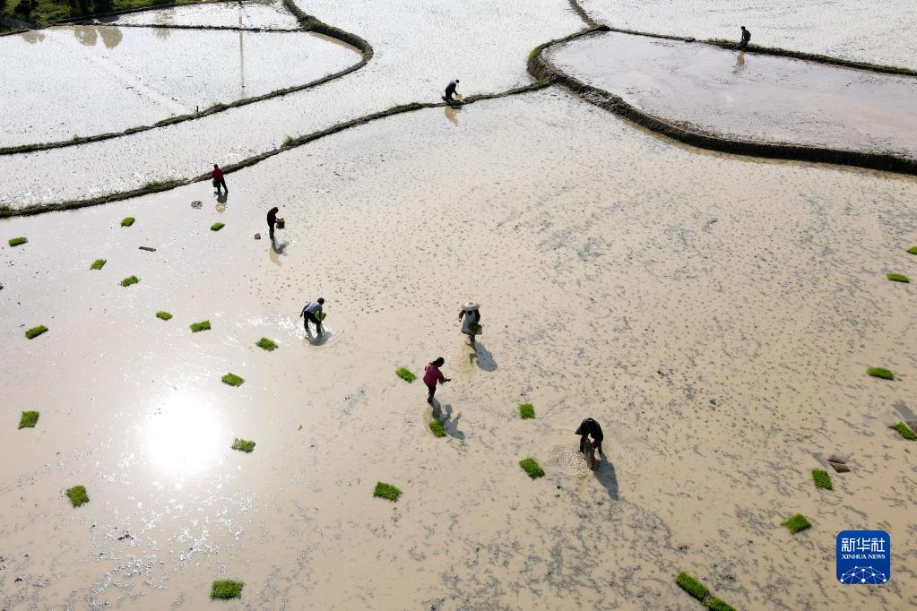 4月6日,在湖南省婁底市雙峰縣井字鎮花山村,農民在田間拋秧(無(wú)人機照片)。