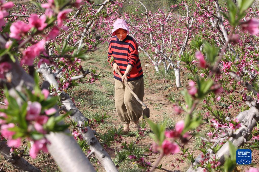 4月10日,河南省焦作市博愛(ài)縣寨豁鄉玄壇廟村,果農們在冬桃園里鋤草。