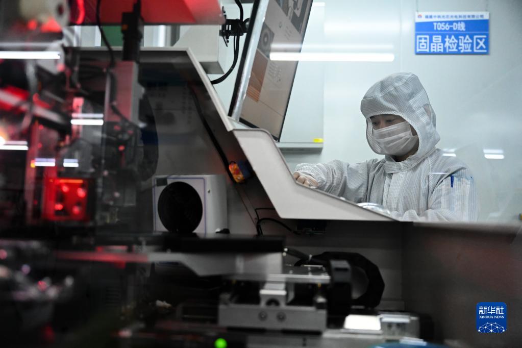 4月12日,在福建泉州石獅市的一家光芯片生產(chǎn)企業(yè),技術(shù)工人在車(chē)間里忙碌。