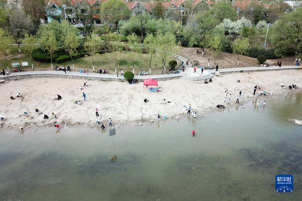 4月24日,在西寧市城西區白沙灘公園內,孩子們在沙灘上玩耍(無(wú)人機照片)。
