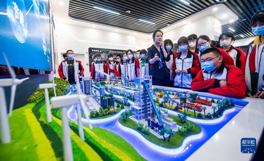 4月24日,在航天科技集團六院航天液體動(dòng)力展示中心,講解員宋柱英(中)為前來(lái)參觀(guān)的西安市航天中學(xué)學(xué)生講解。