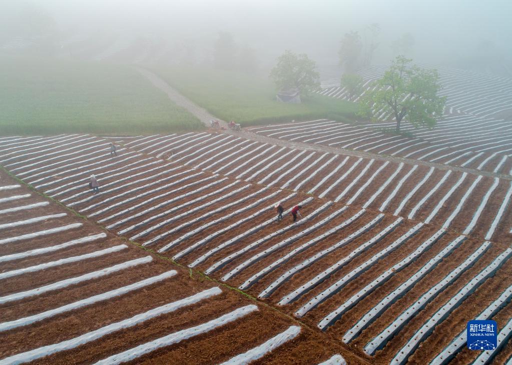 4月26日,漢中市略陽(yáng)縣郭鎮譚家莊村農民在田間勞作(無(wú)人機照片)。