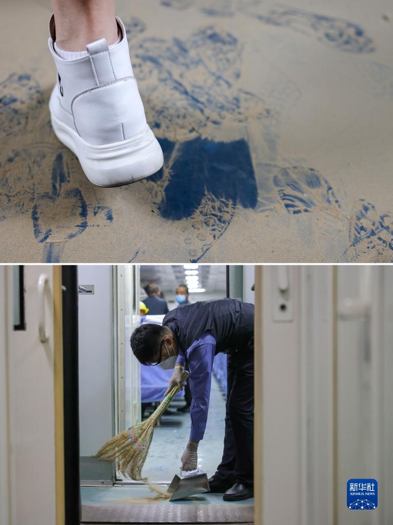 拼版照片:上圖為“和田玉龍號”列車(chē)經(jīng)過(guò)風(fēng)沙區,車(chē)廂連接處落滿(mǎn)沙土(4月27日攝);下圖為“和田玉龍號”列車(chē)員在清掃車(chē)廂連接處的沙土(4月27日攝)。