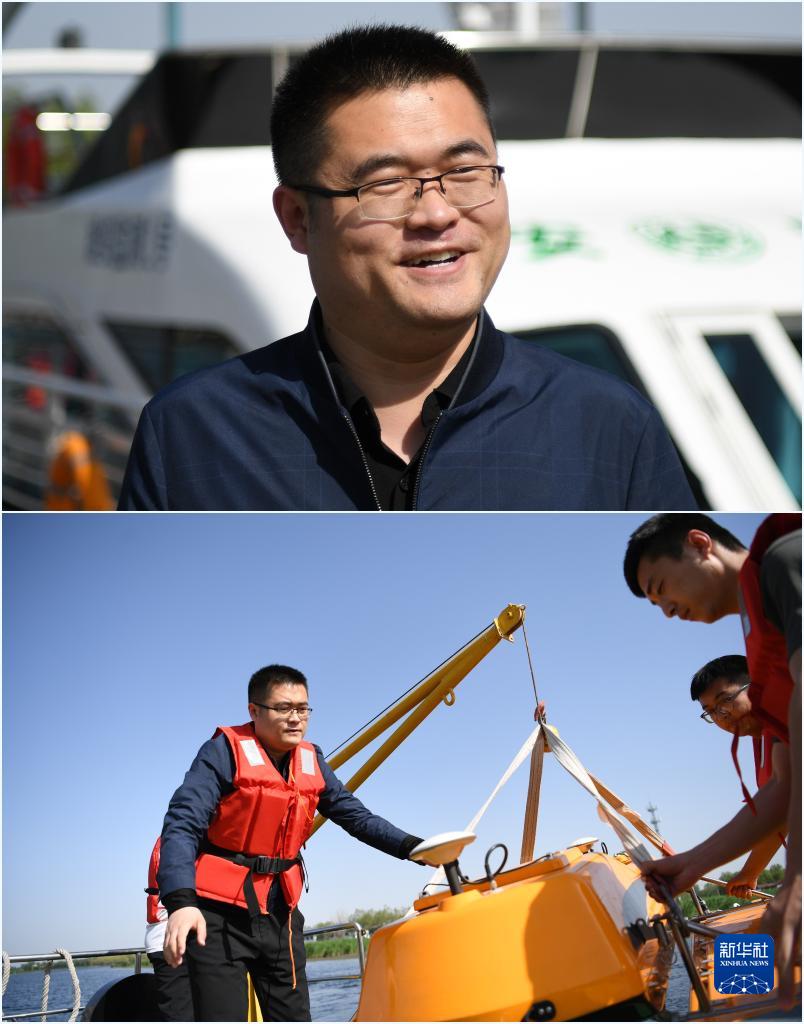 拼版照片:上圖為雄安新區生態(tài)環(huán)境局生態(tài)環(huán)境監測科負責人王英?。?月26日攝);下圖為王英俊在白洋淀準備利用無(wú)人監測船開(kāi)展水質(zhì)監測(4月26日攝)。