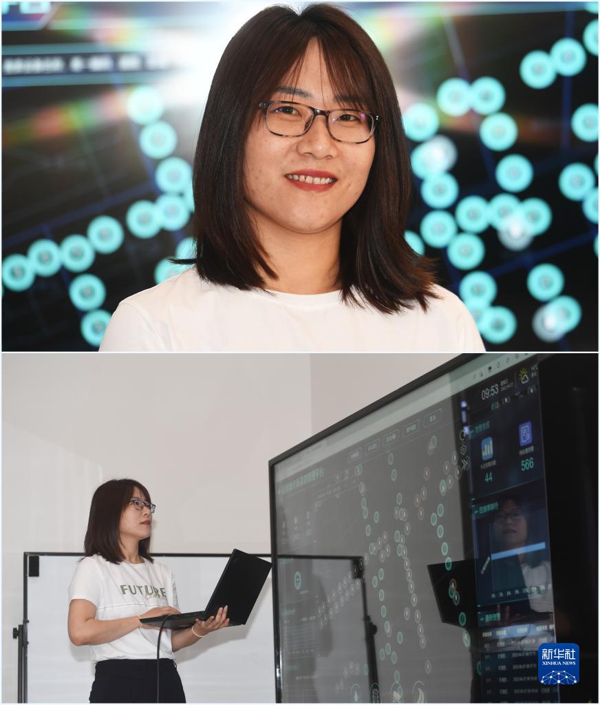 拼版照片:上圖為雄安中電信數字城市科技有限公司工程師許婷婷(4月27日攝);下圖為許婷婷在公司數字道路實(shí)驗室工作(4月27日攝)。