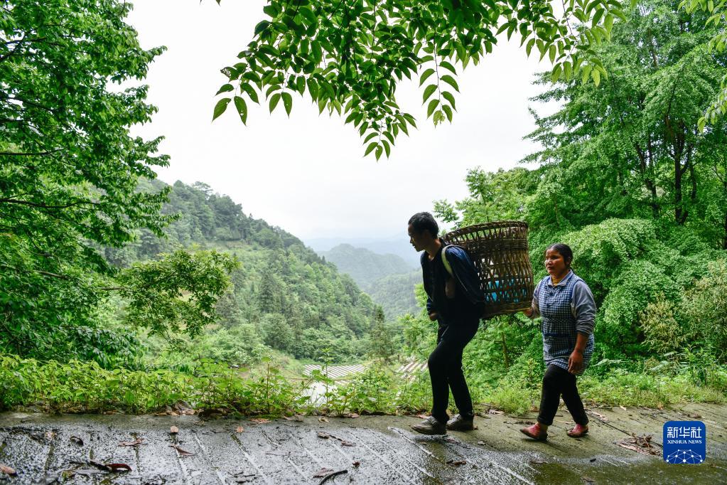 趙友良背著(zhù)背簍,牽引著(zhù)雙目失明的妻子簡(jiǎn)琴下地干活(5月12日攝)。