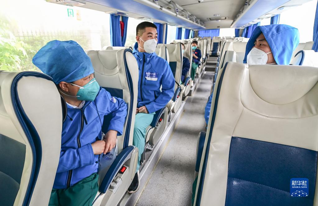 胡鷹鷹(左)在由同濟大學(xué)附屬上海第四人民醫院返回住地的大巴車(chē)上向剛下夜班的隊員問(wèn)詢(xún)院感防控情況(5月13日攝)。