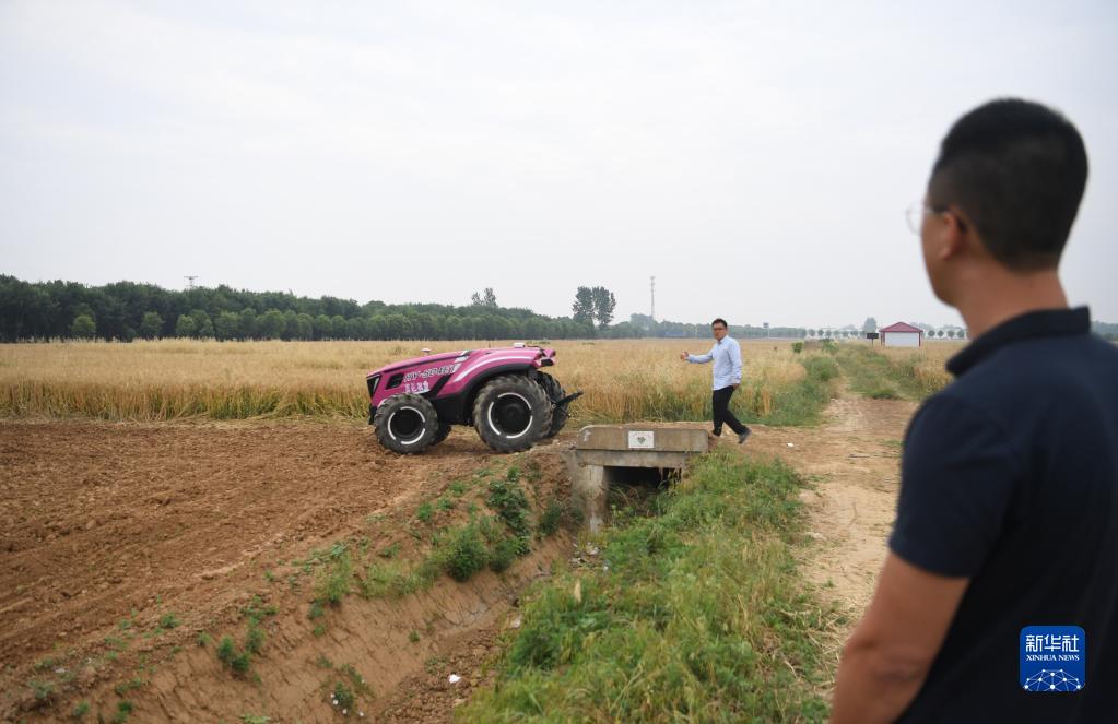 5月25日,在位于河南省鄧州市的首邑農業(yè)(鄧州)無(wú)人農場(chǎng)創(chuàng )新應用基地,沈興新(左)和公司員工交流無(wú)人拖拉機的運行狀態(tài)。