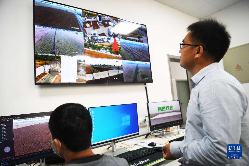 5月25日,在位于河南省鄧州市的首邑農業(yè)(鄧州)無(wú)人農場(chǎng)創(chuàng )新應用基地,沈興新(右)遠程查看麥田情況。