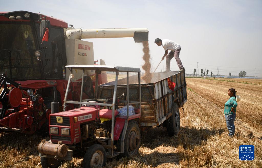 6月7日,在衛輝市劉板橋村,劉建儒(中)在用拖拉機裝收獲的新麥。