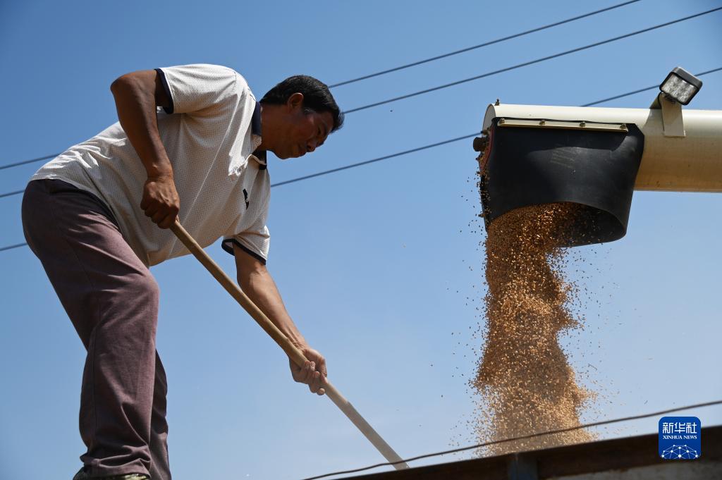 6月7日,在衛輝市劉板橋村,劉建儒在將收獲的新麥裝車(chē)。