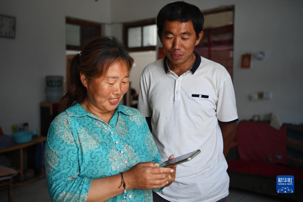 6月7日,在衛輝市劉板橋村,看著(zhù)手機上收糧點(diǎn)打來(lái)的賣(mài)糧款,劉建儒(右)和牛玉蘋(píng)很高興。