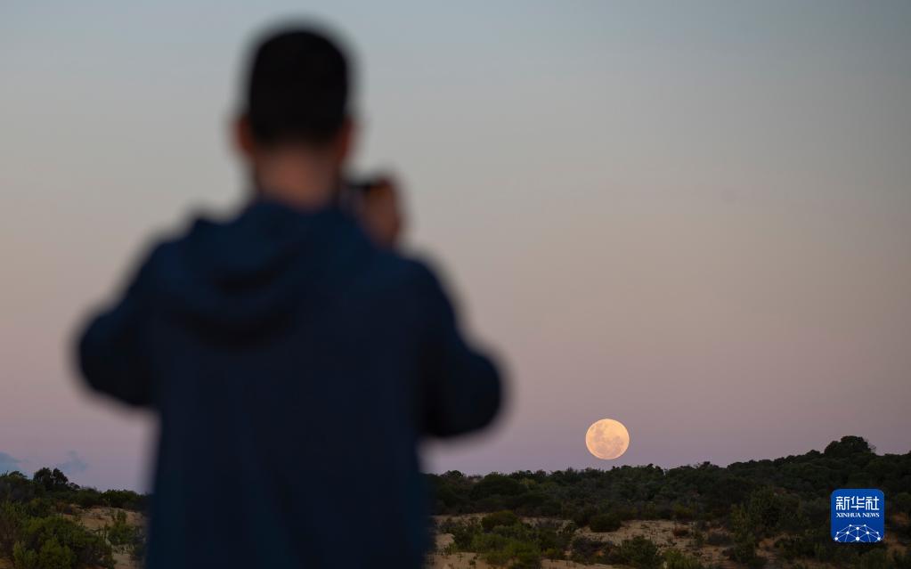6月14日,一名男子在位于澳大利亞西澳大利亞州的尖峰石陣拍攝“超級月亮”。