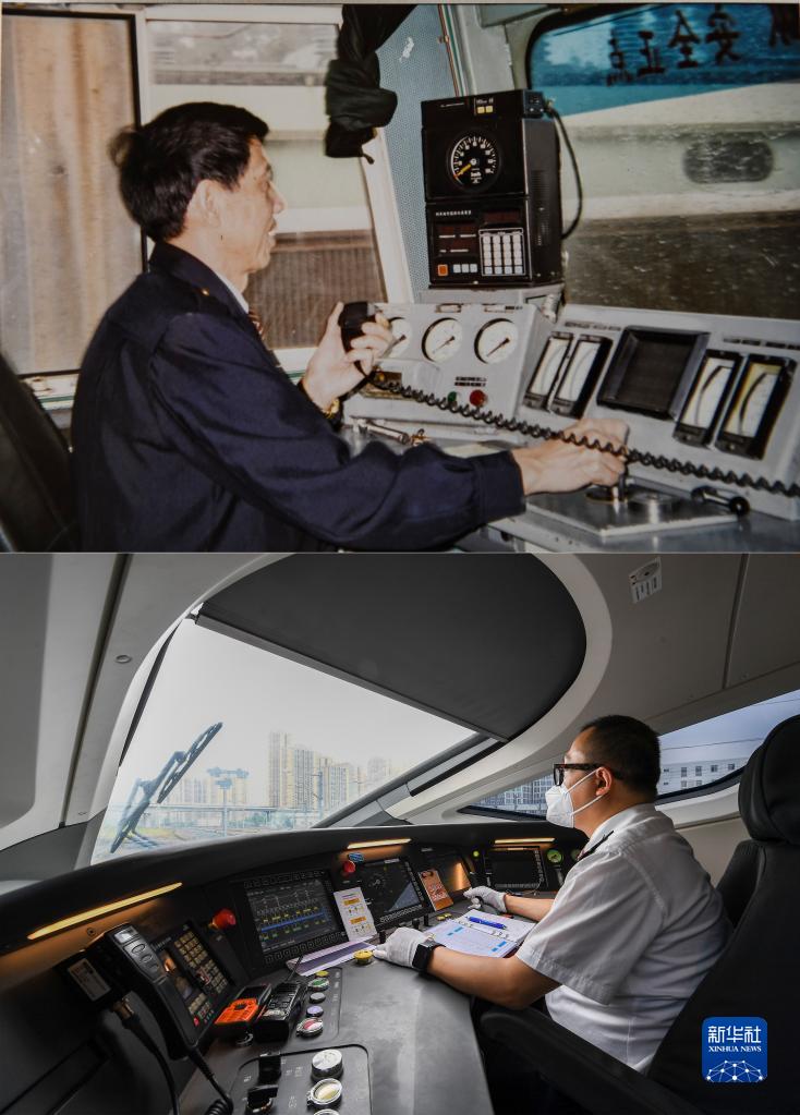 拼版照片:上圖是李國方在重慶西機務(wù)段SS3型電力機車(chē)上操作(翻拍照片);下圖是6月24日,李治剛駕駛復興號動(dòng)車(chē)組由成都東站開(kāi)往重慶沙坪壩站。