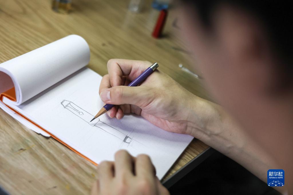7月1日,袁建在位于貴州大學(xué)國家大學(xué)科技園的工作室繪制設計草圖。