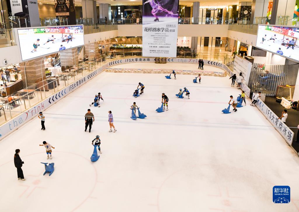 6月26日晚,游客在重慶江北嘴一商場(chǎng)內的滑冰場(chǎng)體驗。