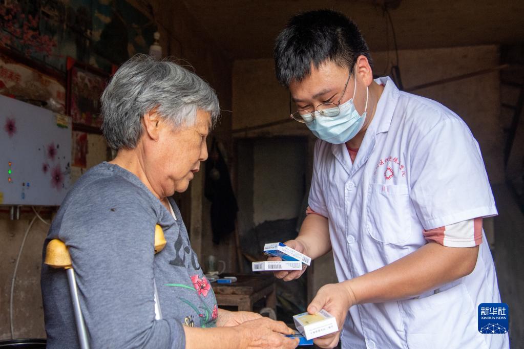 7月1日,村醫胡嘯(右)在一名村民家中為她講解藥品的服用方法。