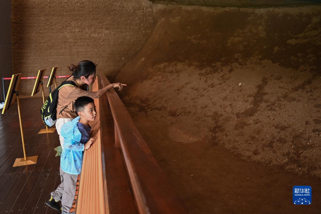 7月6日,觀(guān)眾在老虎嶺水壩遺址展示館內參觀(guān)沙袋覆土回填保護區。