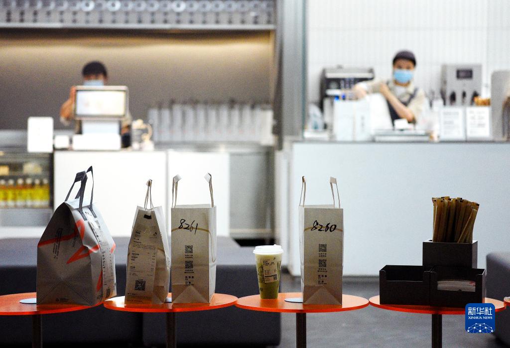 7月6日,在西安市未央區一家奶茶店內,餐品被放置在門(mén)口等待市民自提。
