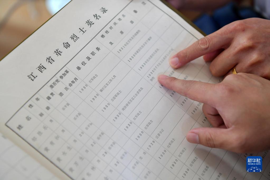 在江西省樂(lè )平市退役軍人事務(wù)局,程雪清和工作人員在江西革命烈士英名錄上查找他要尋找的烈士(7月6日攝)。