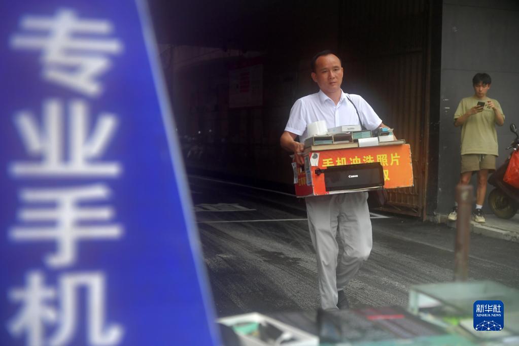 在江西省樂(lè )平市街頭,程雪清抱著(zhù)他的電腦和工具箱準備開(kāi)始擺攤做生意,多年來(lái),他一直從事手機貼膜的工作(7月7日攝)。