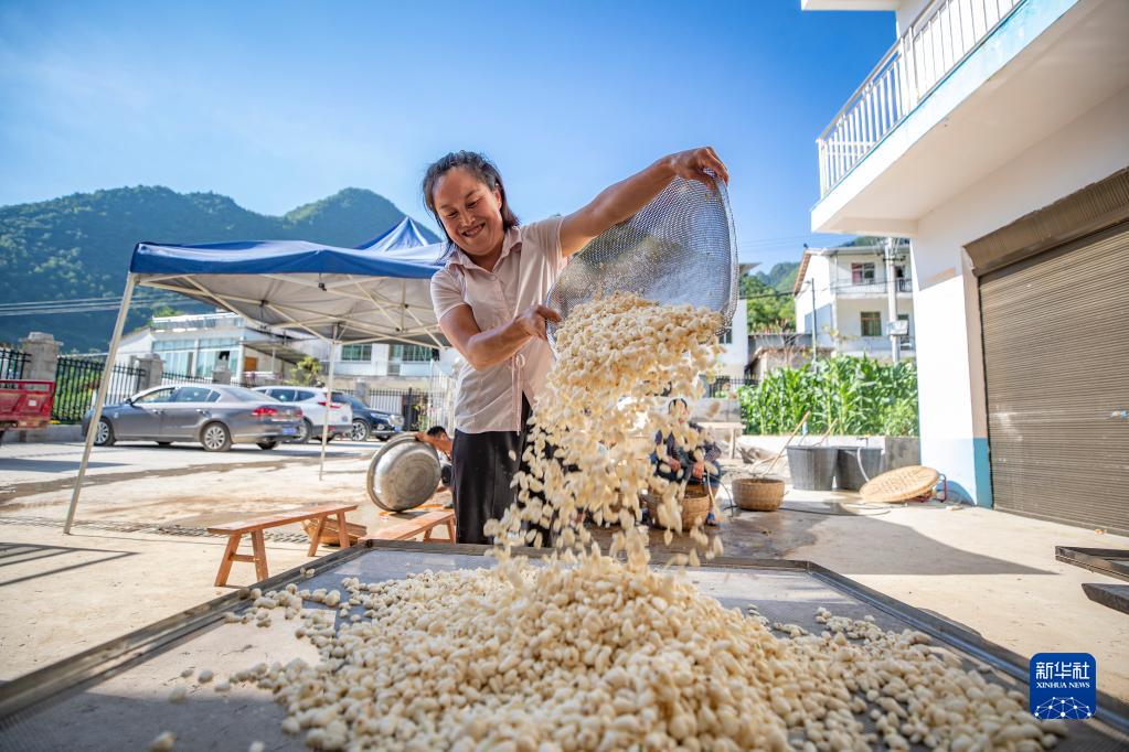 7月14日,在重慶市巫溪縣蘭英鄉西安村,村民將貝母倒入烘干托盤(pán)。