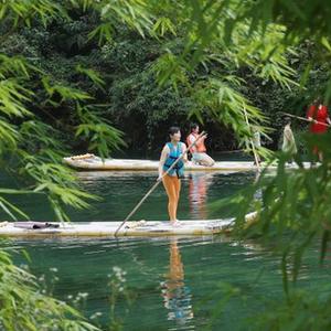 7月16日,游客在湖北省宜昌市秭歸縣三峽竹海生態(tài)景區體驗竹筏親水項目。
