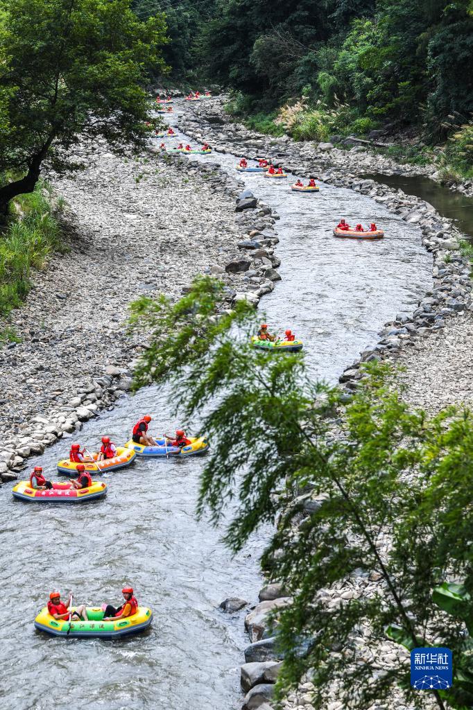 7月17日,在位于湖南省常寧市的天堂山國家森林公園,孩子們在家長(cháng)的陪伴下體驗水上漂流。