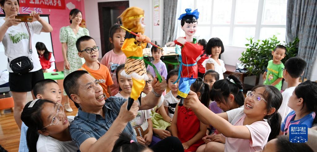 7月17日,在四川省南充市嘉陵區黃蓮灣社區兒童之家,國家級"非遺"項目川北大木偶戲傳承人李樂(lè )帶孩子們體驗“非遺”魅力。