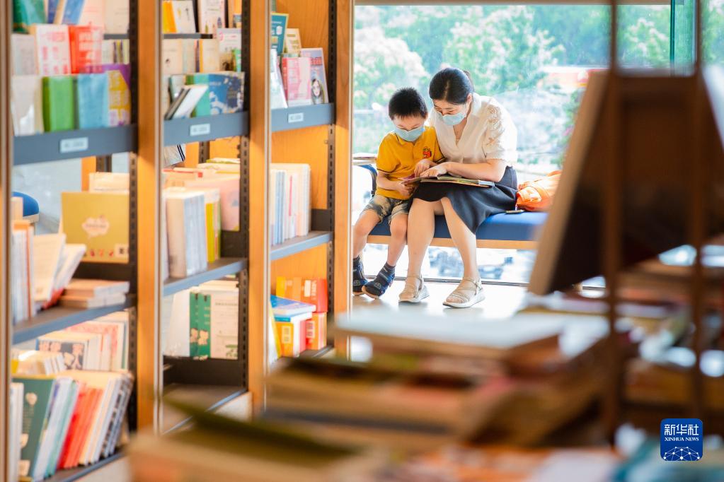 7月17日,家長(cháng)陪伴孩子在南京一家書(shū)店內閱讀。