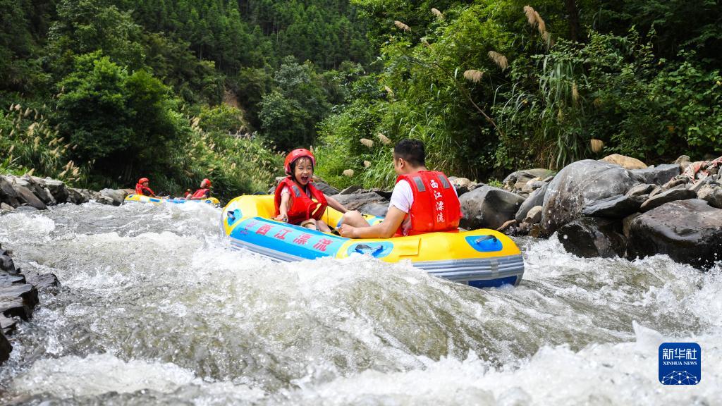 7月17日,在位于湖南省常寧市的天堂山國家森林公園,孩子在家長(cháng)的陪伴下體驗水上漂流。