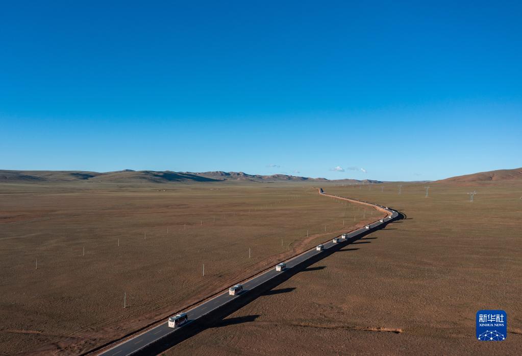 從雙湖縣出發(fā)的車(chē)隊行駛在前往森布日安置點(diǎn)的道路上(7月19日攝,無(wú)人機照片)。