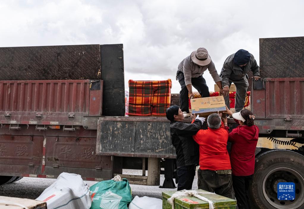 雙湖縣多瑪鄉果根擦曲村村民將行李搬上貨車(chē)(7月12日攝)。