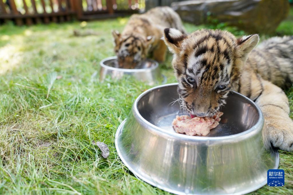 7月29日,兩只東北虎幼虎在中國橫道河子貓科動(dòng)物飼養繁育中心進(jìn)食。