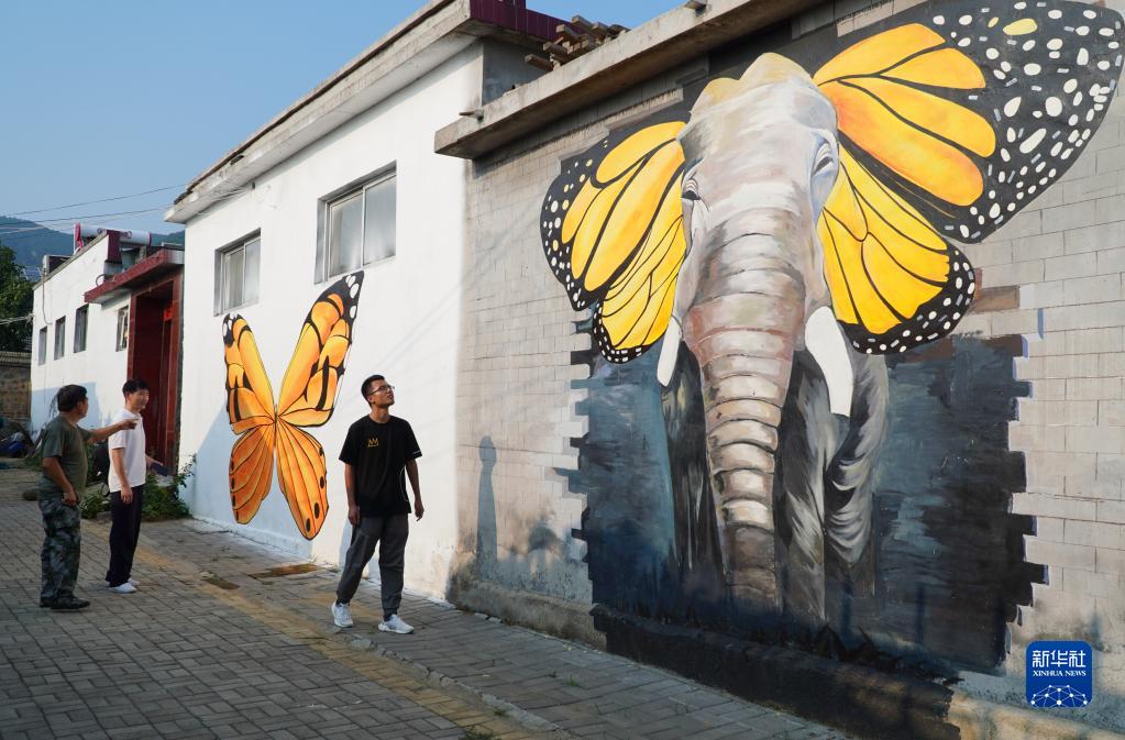 8月3日,幾名游客在北張村觀(guān)賞墻繪藝術(shù)畫(huà)。