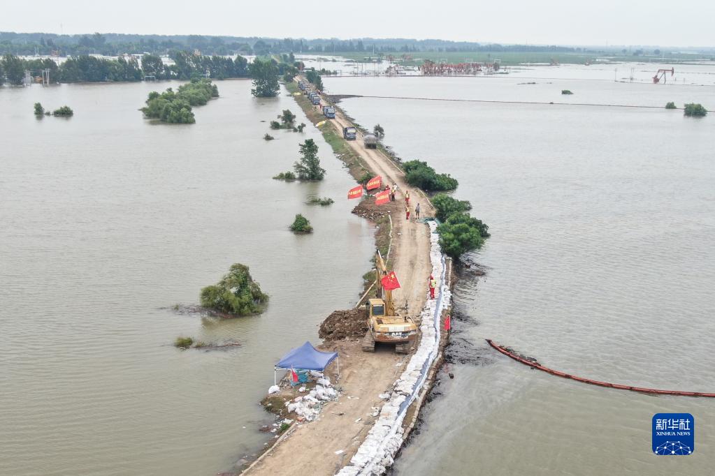 8月3日,參與搶險的工作人員在遼寧省盤(pán)錦市繞陽(yáng)河左岸曙四聯(lián)段潰口附近作業(yè)(無(wú)人機照片)。