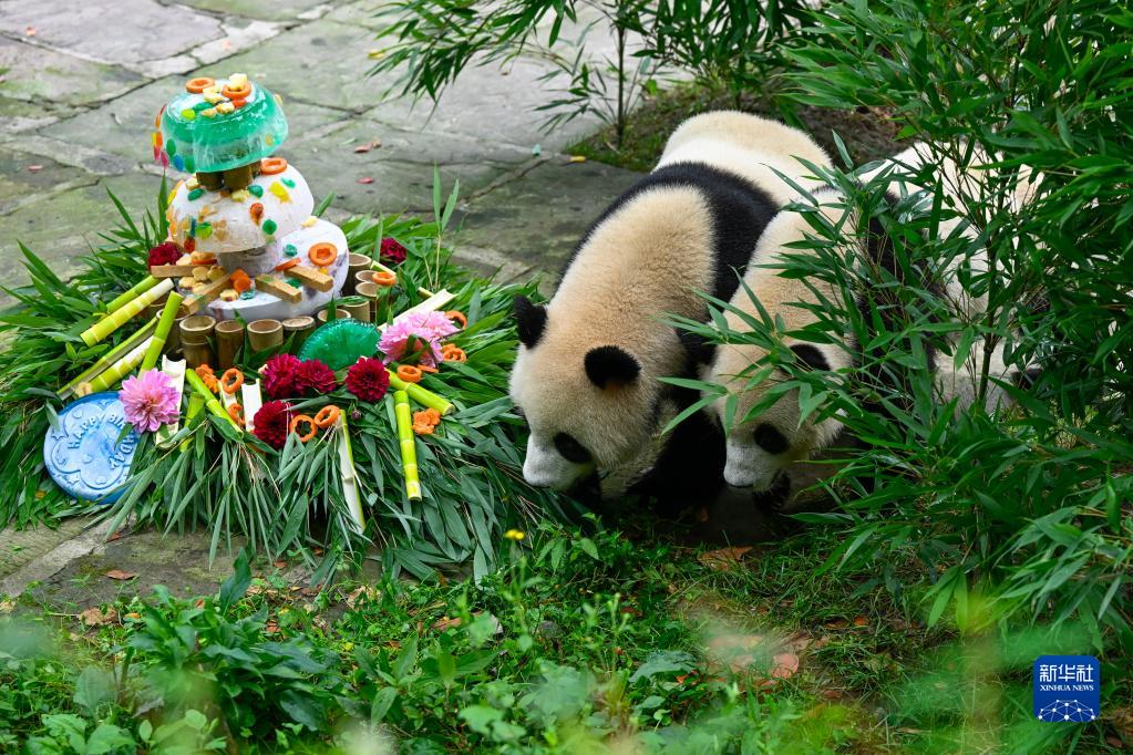 8月3日,在中國大熊貓保護研究中心雅安基地,大熊貓“雅雅”“安安”準備享用美食。
